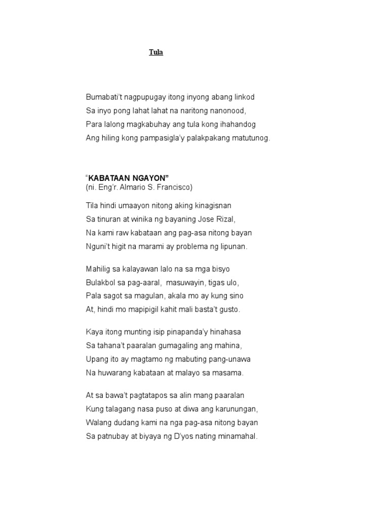 Tula Tungkol Sa Pilipino At Espanyol Ang Tula Sa Panahon Ng Mga Kastila. 23072019 HALIMBAWA NG TULANG PANUDYO Kahulugan At Mga Halimbawa. Mga nagwaging COVIDiona COVIDagli COVIDalit.